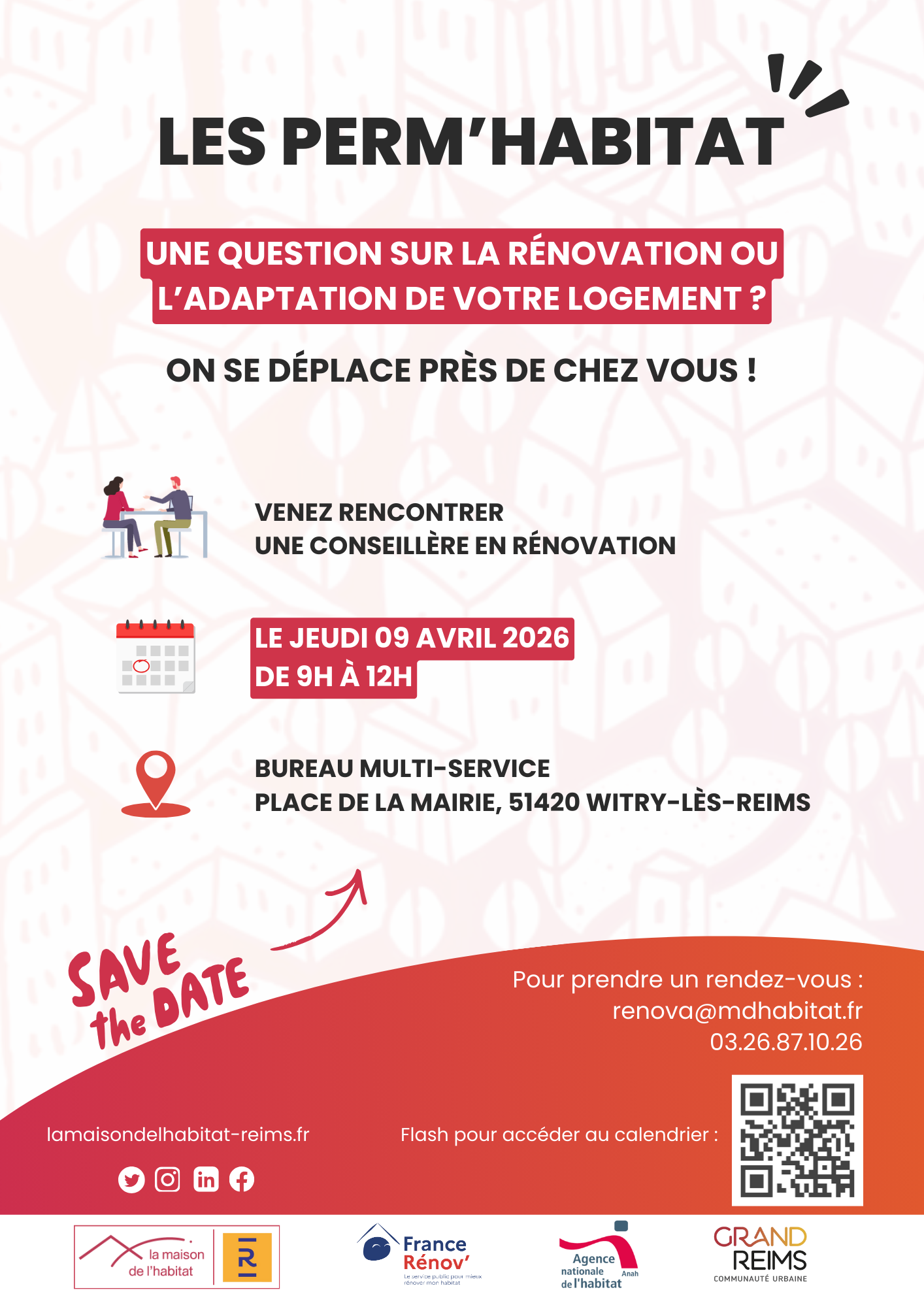 La Maison de l’habitat sera présente le jeudi 9 avril 2026 de 9h00 à 12h00 à la mairie de Witry-lès-Reims (Bureau multi service) pour une permanence d’information pour vous orienter vers les acteurs de l'habitat, vous informer et répondre à vos questions autour du logement (démarches et aides financières, la location, l’accession à la propriété, bien vivre dans son logement, les gestes éco-responsables...)